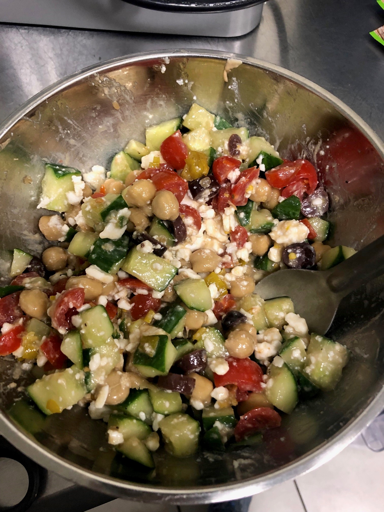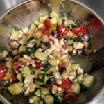 • Toss all of the chopped ingredients together with the chickpeas, pumpkin seeds and feta